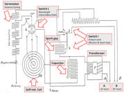 The main parts of the electric circuit are the transformer, capacitor, spark gap and a