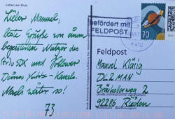 Auf dem Clubstationsgelände findet im Oktob er ein Notfunkt reffen statt, bei dem auch die beiden UG-OEL’s (= örtlic he Einsatzl eit ung) der St adt Amberg und des Landkreises mit i hren beiden Einsatzfahrzeu gen anwesend sind, ebenso d as THW mit Fahrzeug Bild: DM1CHL DC6RN Eine weit ere Folg e unserer T eilnahme a n "Blac kFriday" : An der Clubstation tr effen si ch auf Initiative der Bundeswehr mehrere OMs und BOS-Leute zu einem Gespräch, wi e sic h bei einem möglichen BlackOut auch i n Z ukunft unsere Zusamme narbeit gestalten ka nn. Und endlich wieder ein   Sommerfest! Das konnte im Aug ust en dlich wieder an DL0AO stattfinden und erfreute sich bei bestem Wetter großer Belie btheit! VLF und Pe  rseus DK1IS un d DF9 RB h a lten das VLF-Equipm ent un d die dazuge hörigen Antennen an DL 0AO sowie die Perseus-Empfänger a m Laufen, pf legen und verbessern kontinuierlich unsere exzellente Empfangssituatio n a n DL0AO. QSL  …QSL… DL4RCF sorgt trotz Corona auch 2022 zuverlässig für unseren Karten-Austausch! Proje  kte Der kleine (t r)SDX von DL2MAN ist nach wie vor sehr gefragt! Dazu boten Manuel und DL4MDI auch bei m Zusamme nbau ihre Hilf e an: DC 6RN und DC1RME können dies en Wor kshop an DL0AO mit einen fun ktionierende n Kleintransceiver verlassen. DL2MAN und DJ5RE bauen die „U 01-Antenne“ v on Thomas weiter aus, es ents teht eine Leichtbauweise und DL2 RDT organisiert dafür eine Sa mmel- bestellung der B auteile. Manue l betreibt übrigens einen You tube-Kanal, auf de m e r unter ande rem au ch über die Portabel-Einsätz e filmisch berichtet. Pos itives Feedba ck kommt aus nah u nd fern! You tube-Link: https://www.youtube.  com/@dl2man/videos
